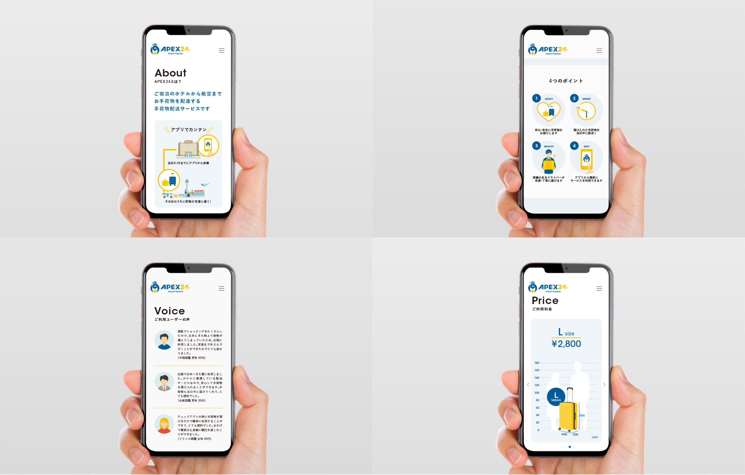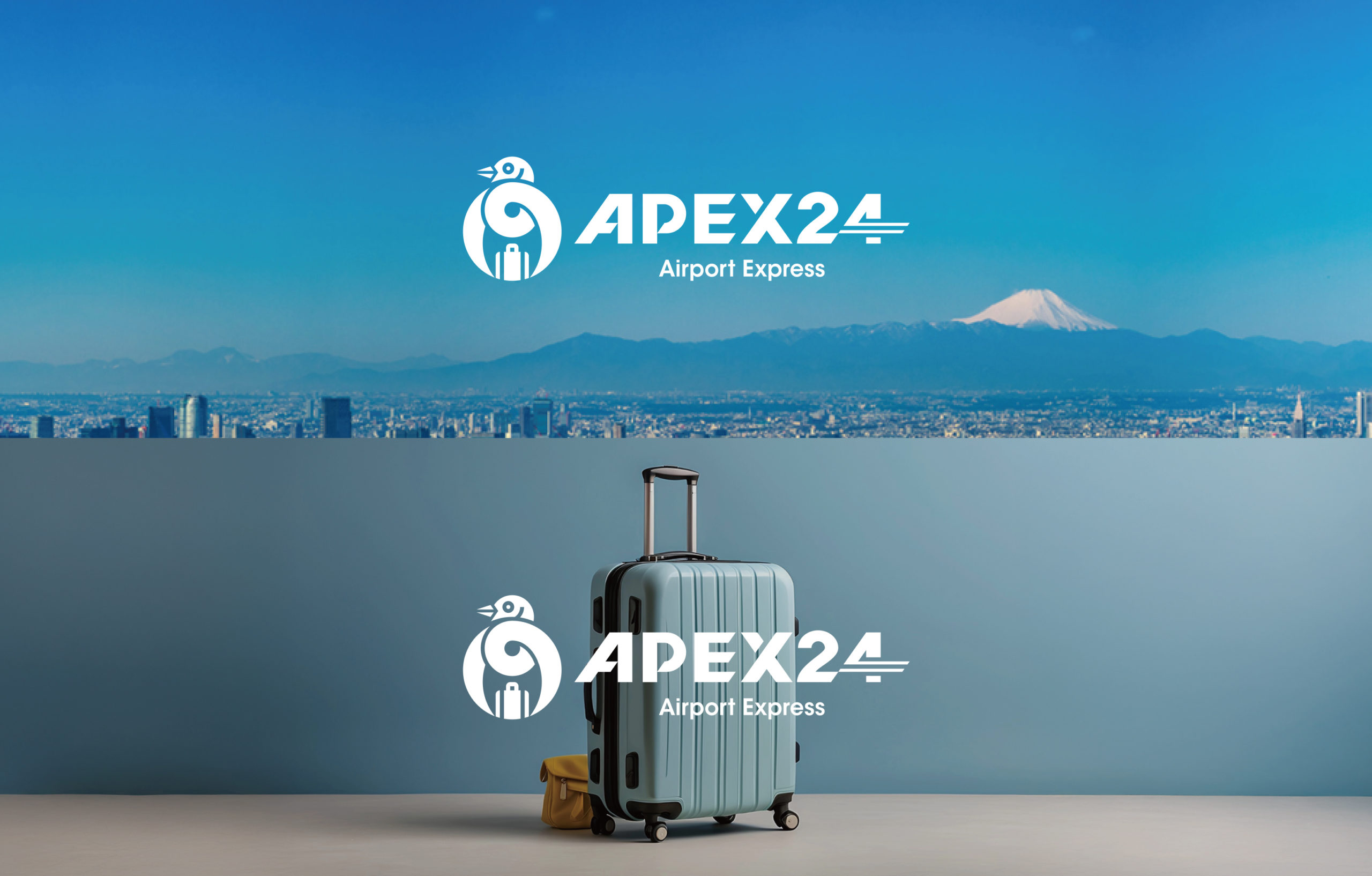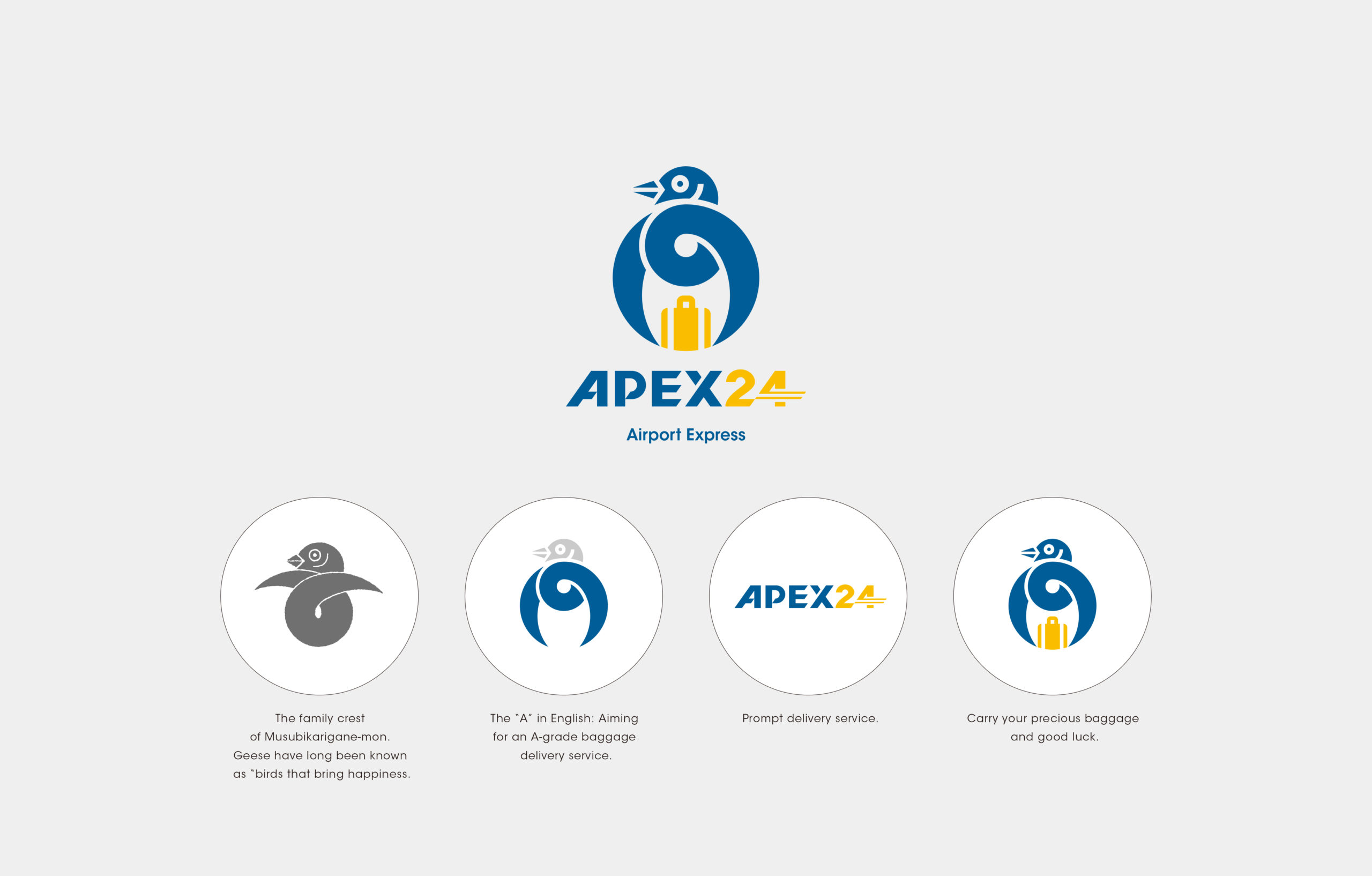 The symbol mark for APEX24, which aims to provide prompt and courteous baggage delivery services mainly to foreign tourists visiting Japan, was designed to represent the “A” in the name, based on a family crest with a distinctly Japanese flavor. The family crest “Musubikarigane-mon” (the family crest of the Japanese family) is a “goose” meaning “bird that brings happiness,” and thus represents the A-rank delivery service that carries customers’ precious baggage and good fortune. The main color blue represents the color of the sky, which is highly compatible with the airport, and the yellow color at the important “baggage” and “24” points signifies the happiness of the tourist’s journey and the speed of our prompt service.