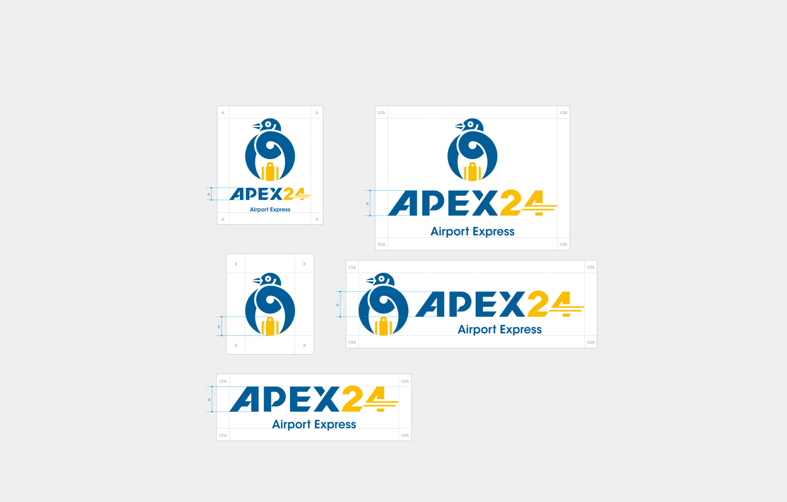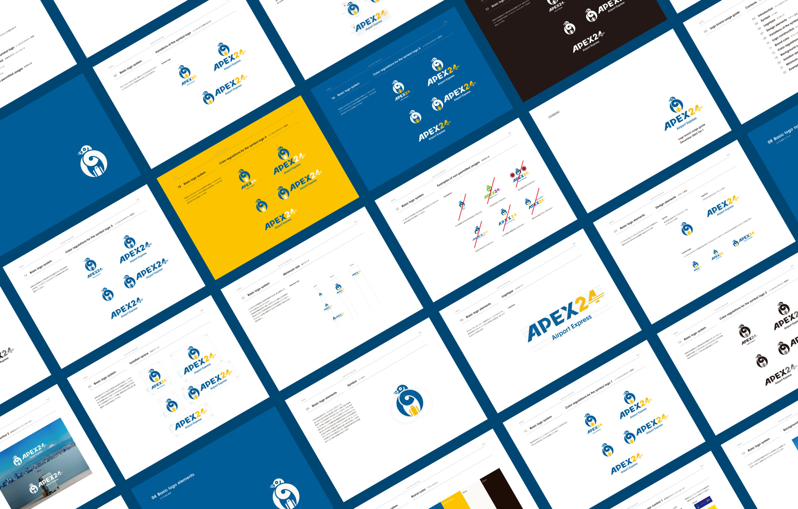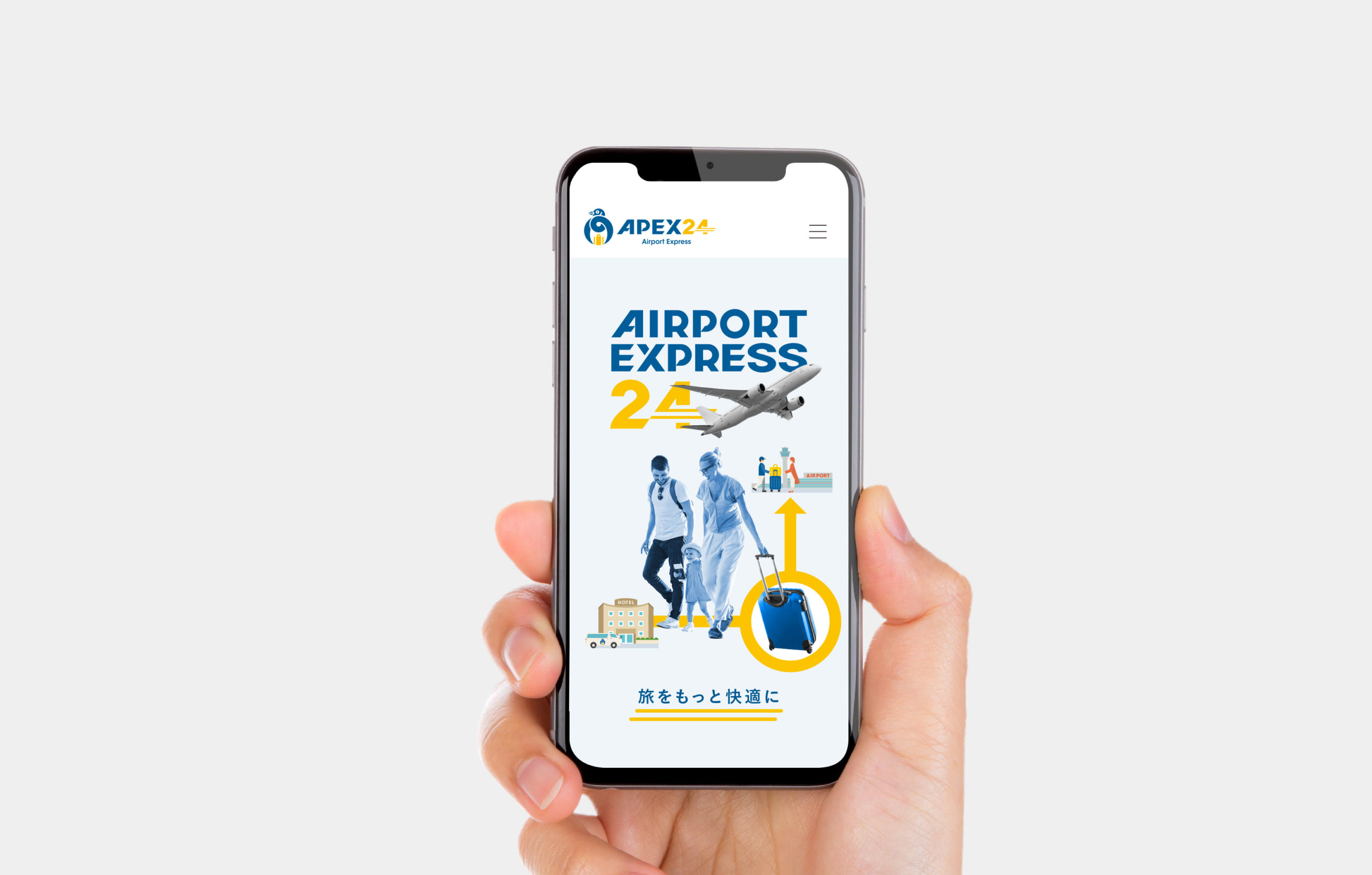 The symbol mark for APEX24, which aims to provide prompt and courteous baggage delivery services mainly to foreign tourists visiting Japan, was designed to represent the “A” in the name, based on a family crest with a distinctly Japanese flavor. The family crest “Musubikarigane-mon” (the family crest of the Japanese family) is a “goose” meaning “bird that brings happiness,” and thus represents the A-rank delivery service that carries customers’ precious baggage and good fortune. The main color blue represents the color of the sky, which is highly compatible with the airport, and the yellow color at the important “baggage” and “24” points signifies the happiness of the tourist’s journey and the speed of our prompt service.
