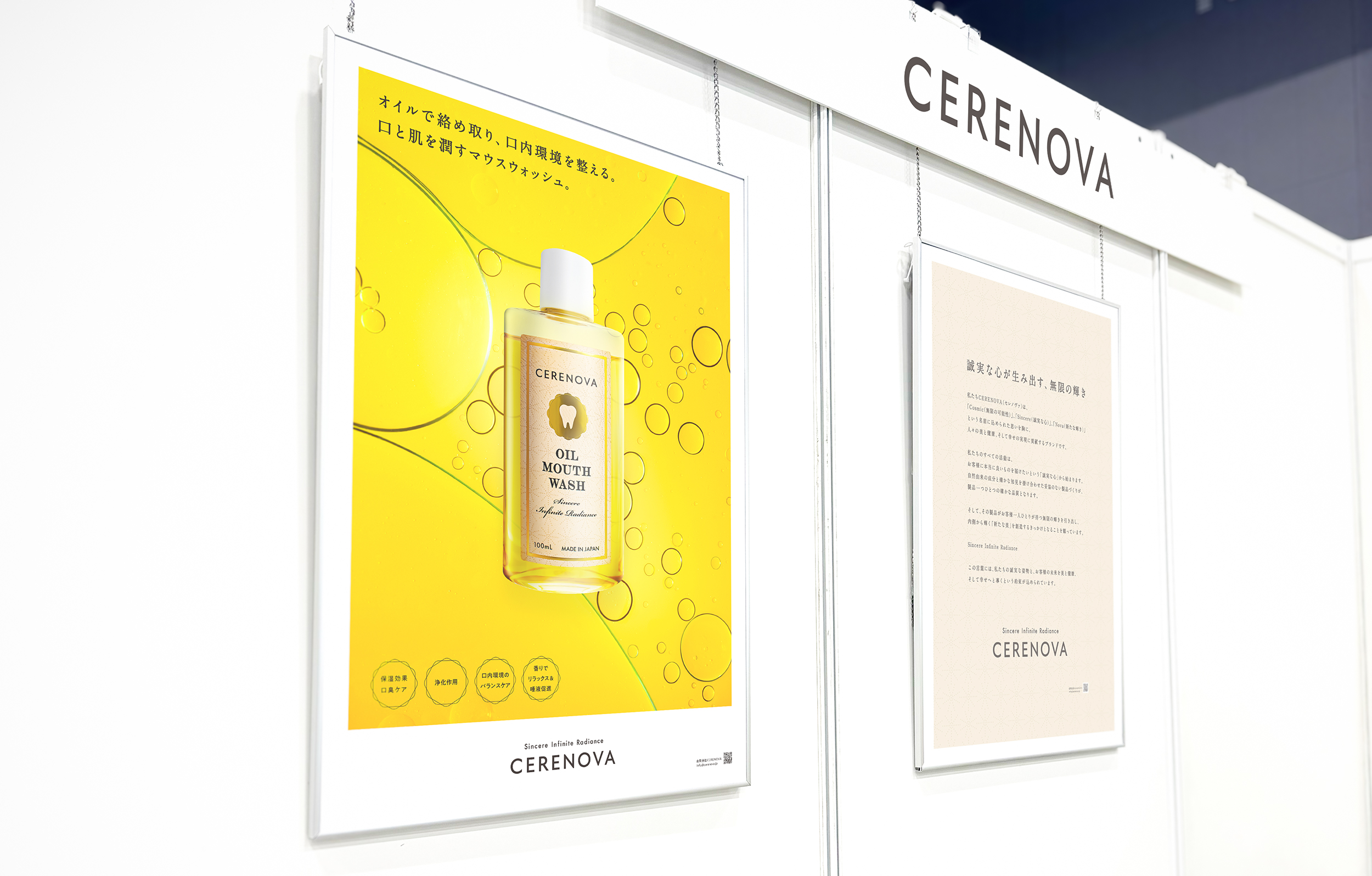 Drawing inspiration from the “radiance” that inspired the name CERENOVA, I created a light pattern graphic for the oil mouthwash. I designed a label that conveys a high-quality feel befitting the product’s price point. Furthermore, I developed a main visual that prominently features the power of the oil, and I consistently applied this visual across all materials, from posters and flyers to leaflets and the website.