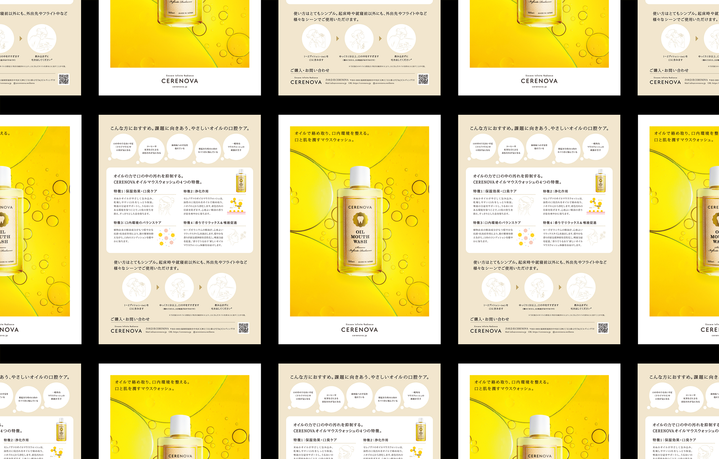 CERENOVAさまの名前の由来である「輝き」をヒントに、オイルマウスウォッシュのグラフィックとして光のパターンを制作。製品の価格帯に見合う高品質な雰囲気を感じられるラベルを設計しました。また、オイルの力を前面に押し出したメインビジュアルを構築し、ポスターからフライヤー、リーフレット、WEBに至るまで、一貫したビジュアルで展開しています。