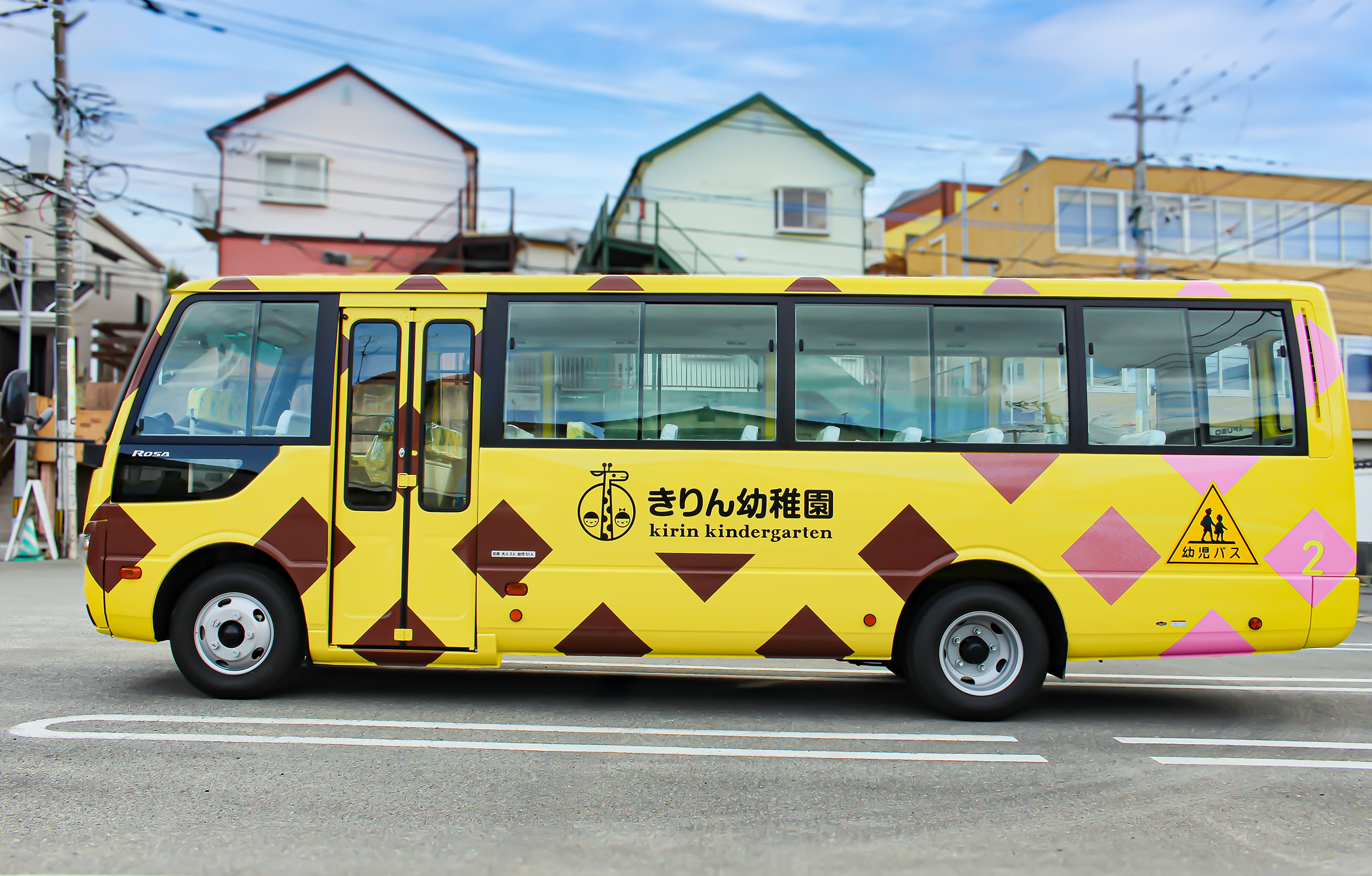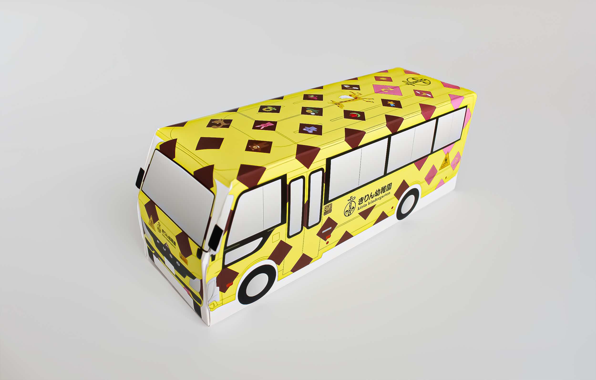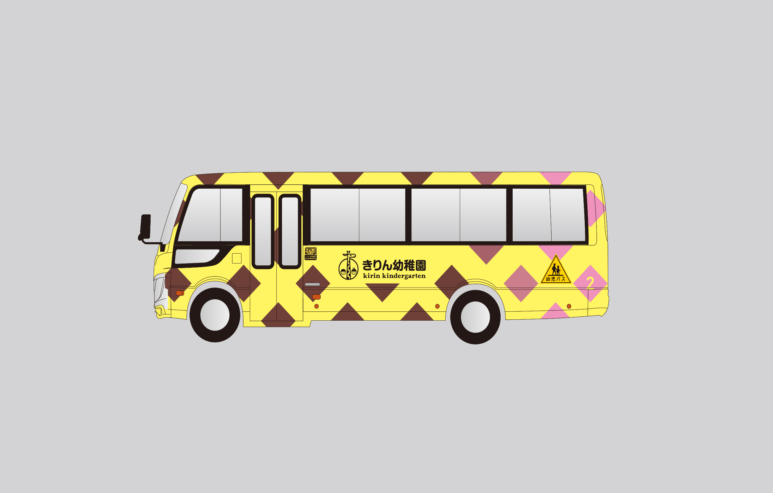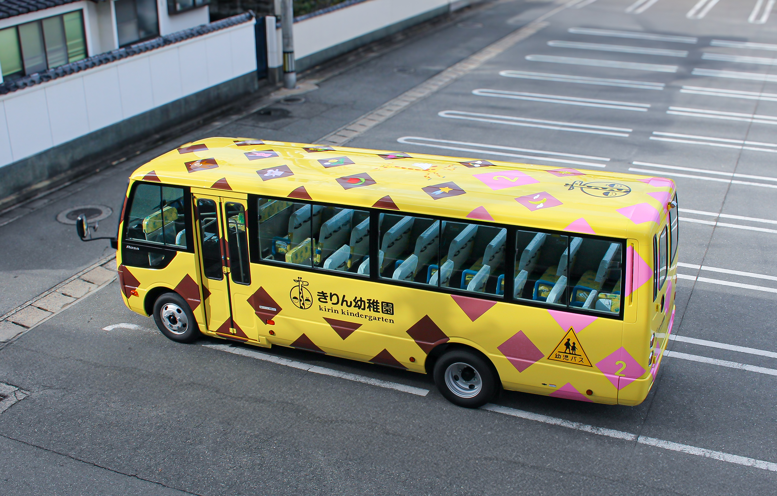 園にゆかりのある方はもちろん、街で見かけた方々にとって「きりんのバス」と感じるよう、福岡の風景に馴染むシンプルで象徴的な「きりん柄」を設計しました。きりん柄をイメージしたダイヤ型には、園児たちの未来を照らす「光」の意味を重ね、正面から見るとバス全体がきりんの顔に見えるような配置にこだわりました。今後、コース別のバスが新調される予定を想定し、後方には各コースのカラー(今回はピンクの2号車)をアクセントとして配置しました。また、マンションなどの高い場所からもデザインを楽しめるよう、天面に園のキャラクターを忍ばせる「サプライズ」の要素も取り入れています。園長先生をはじめ関係者の皆さまに大変喜んでいただけたことが、何よりの励みとなりました。施工難度の高いデザインでしたが、井上総合印刷さまや施工会社の皆さまが素敵に仕上げていただいたことに改めて心より感謝を申し上げます。