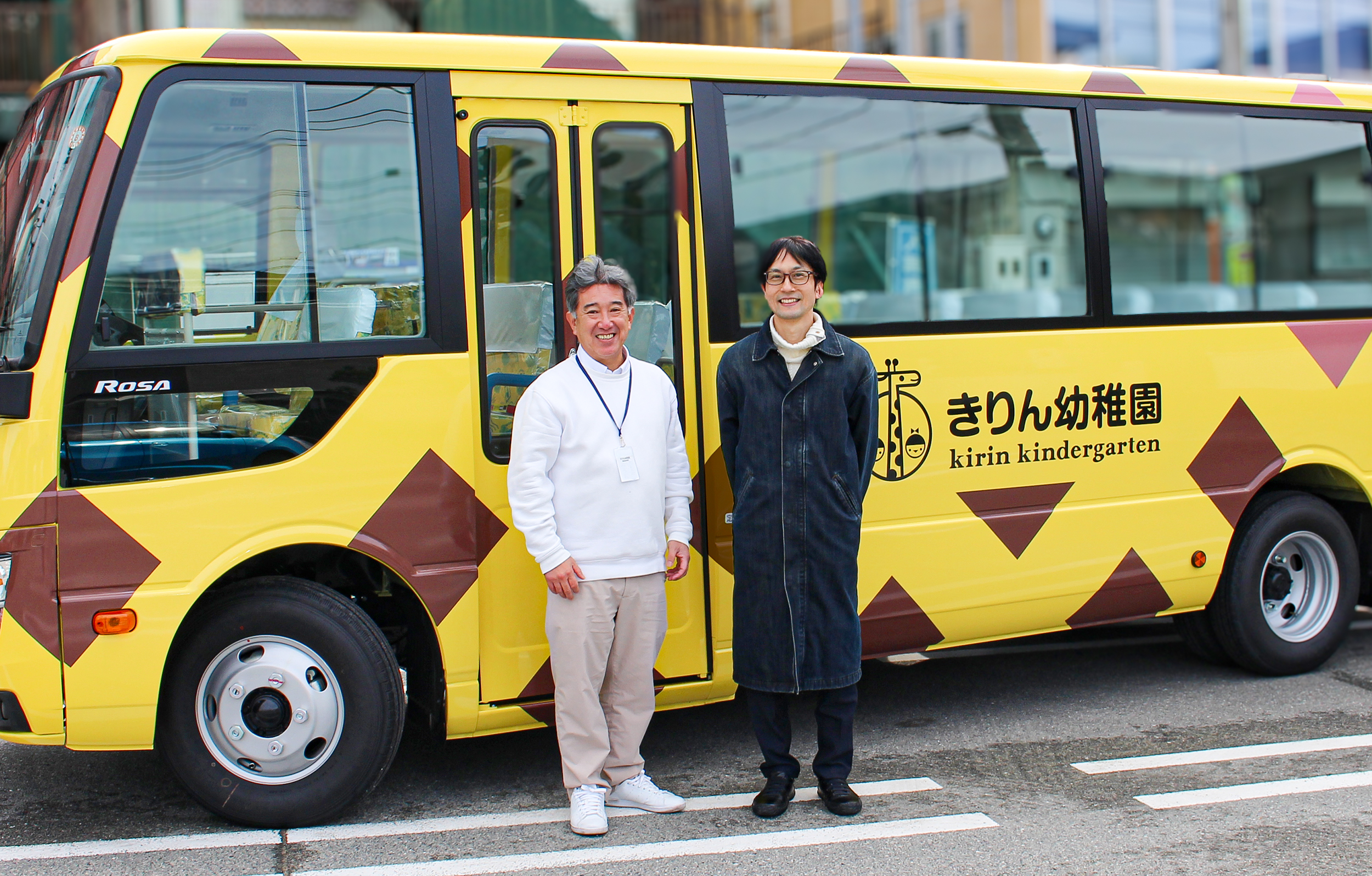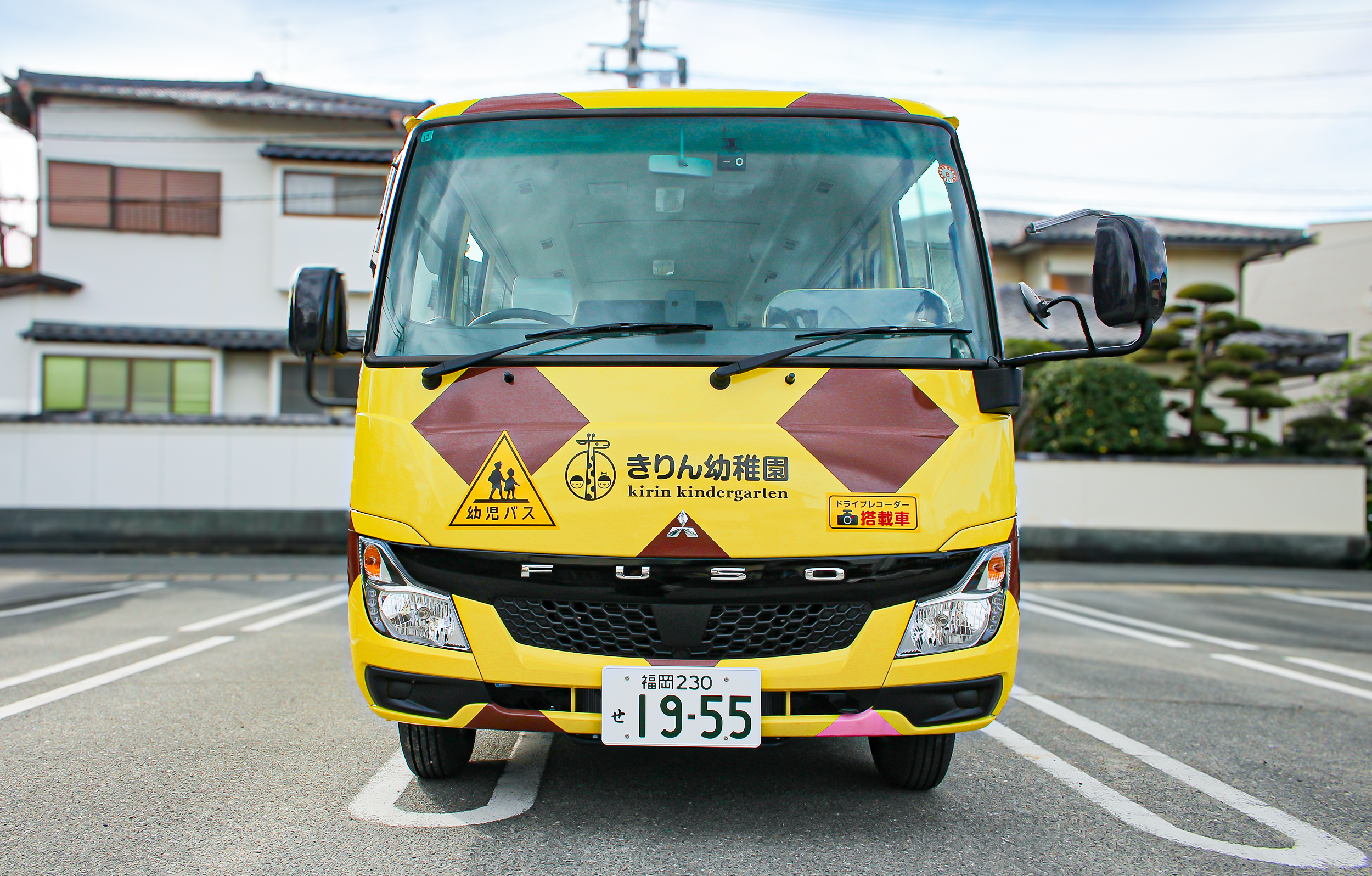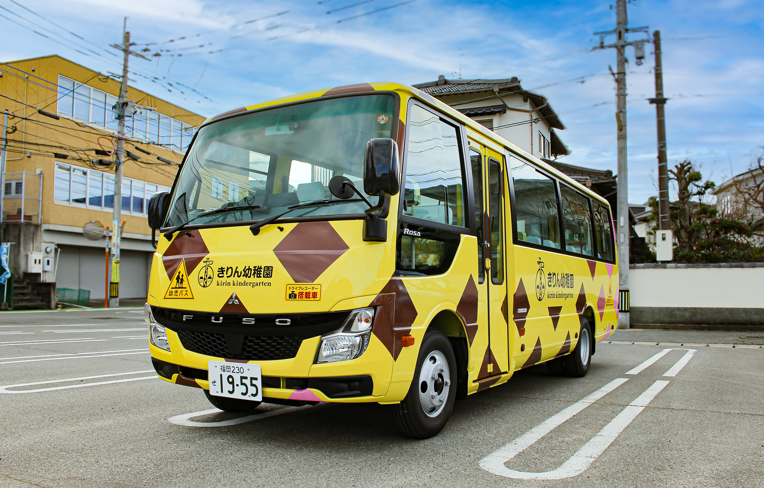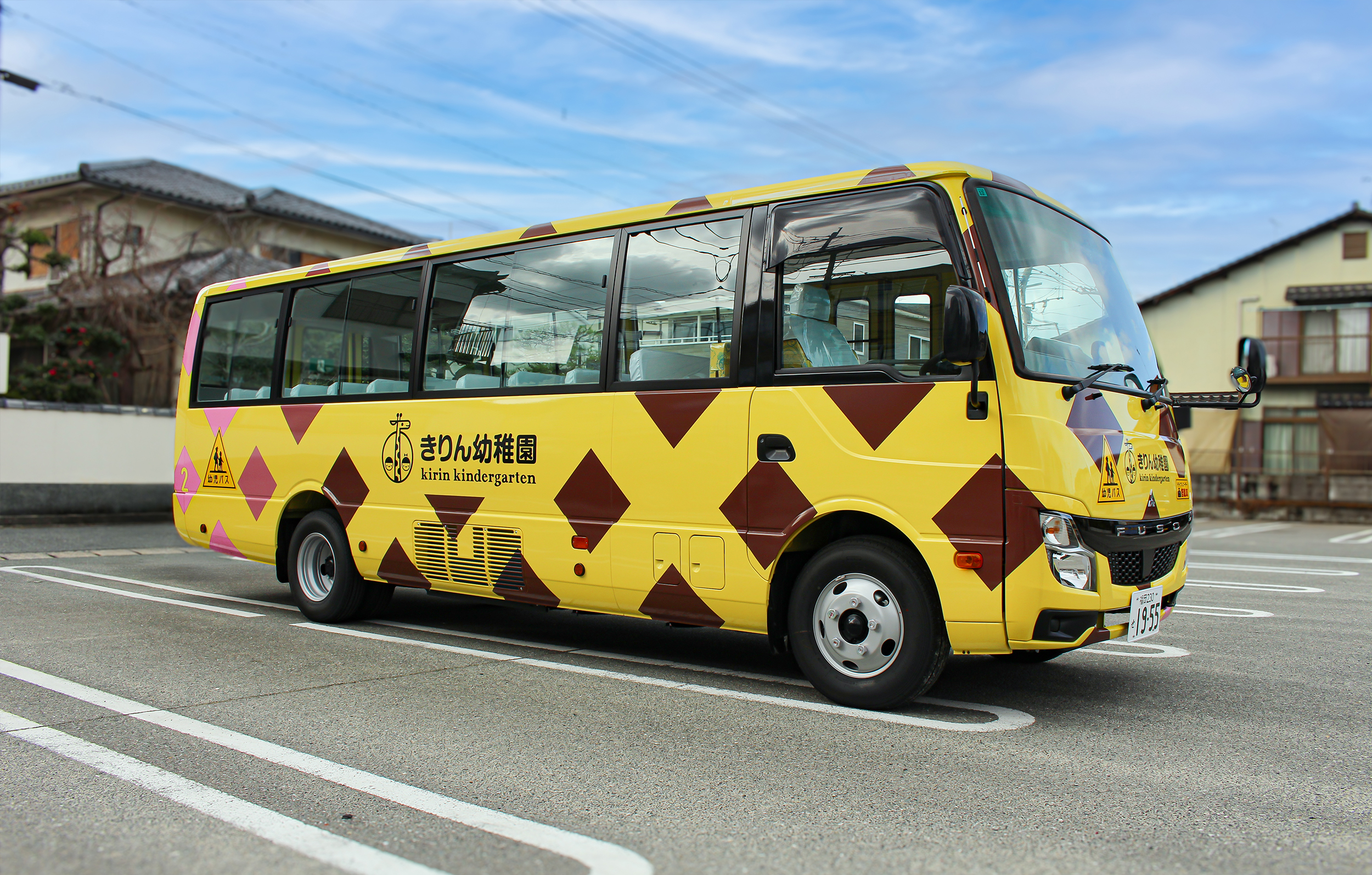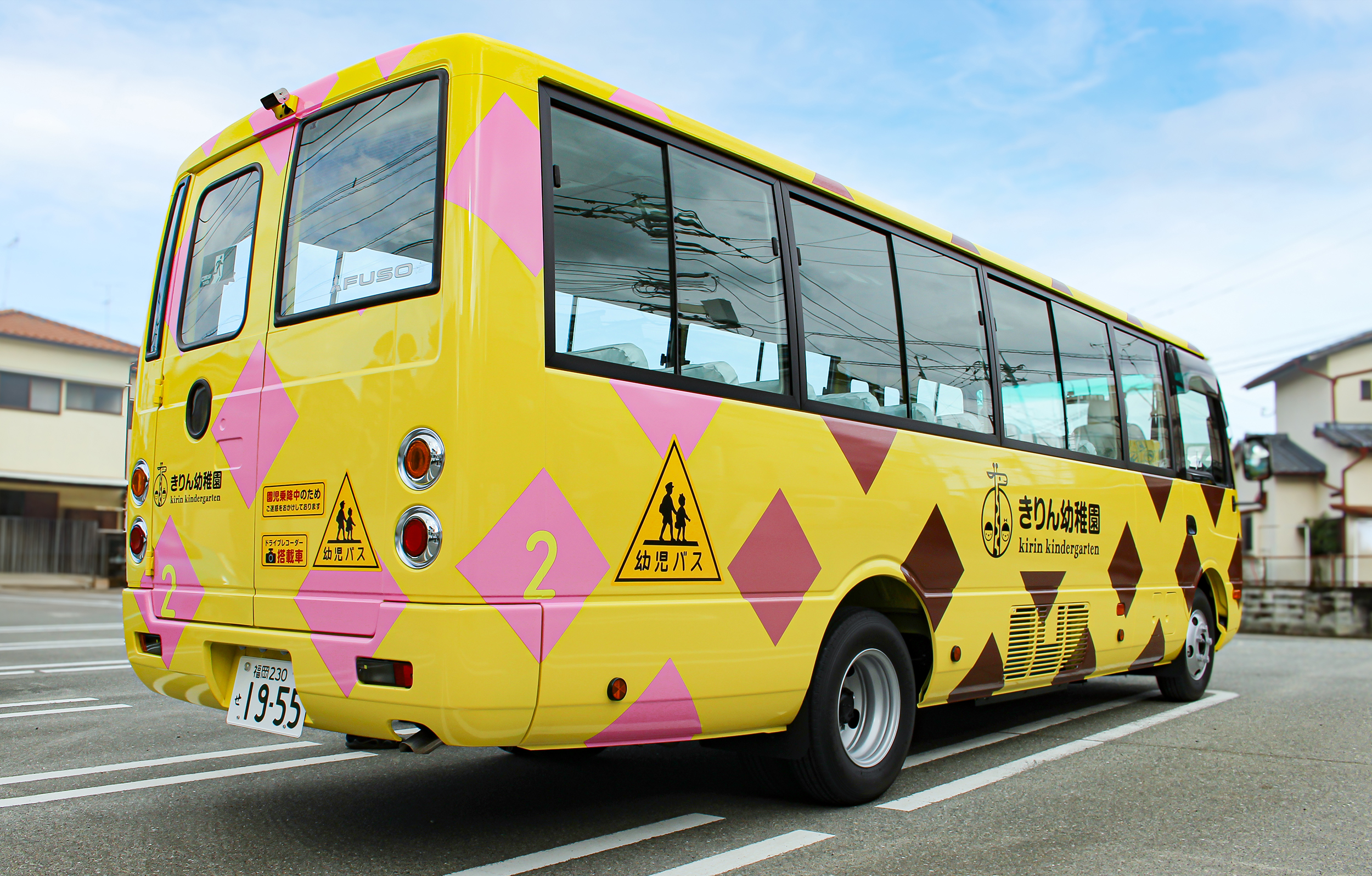 We designed a simple, symbolic “giraffe-patterned” that blends into Fukuoka’s scenery, so that not only those connected to the kindergarten but also passersby would recognize it as the “Giraffe Bus.” The diamond shape, inspired by giraffe patterns, carries the meaning of “light” illuminating the children’s futures. We meticulously arranged the design so that when viewed head-on, the entire bus resembles a giraffe’s face. Anticipating future replacements of buses for different routes, we added each route’s color (pink for Bus No. 2 this time) as an accent on the rear. We also incorporated a “surprise” element: the kindergarten’s mascot character subtly hidden on the roof, allowing the design to be enjoyed even from high vantage points like apartment buildings. The immense joy expressed by the principal and all involved parties was our greatest encouragement. Although the design posed significant construction challenges, we extend our heartfelt gratitude once again to Inoue Sogo Printing and the construction team for their wonderful execution.